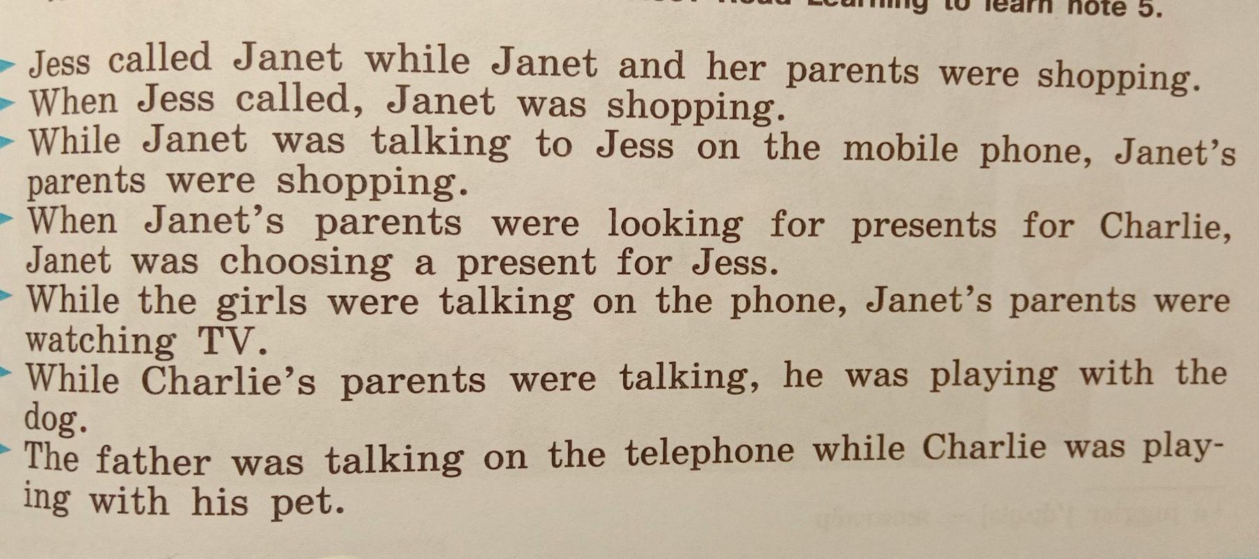 переведите тексты и сделайте такДжесс позвонила (Past Simple) Дженет, а ее родители делали покупки (Past Progressive). (спасибо!)