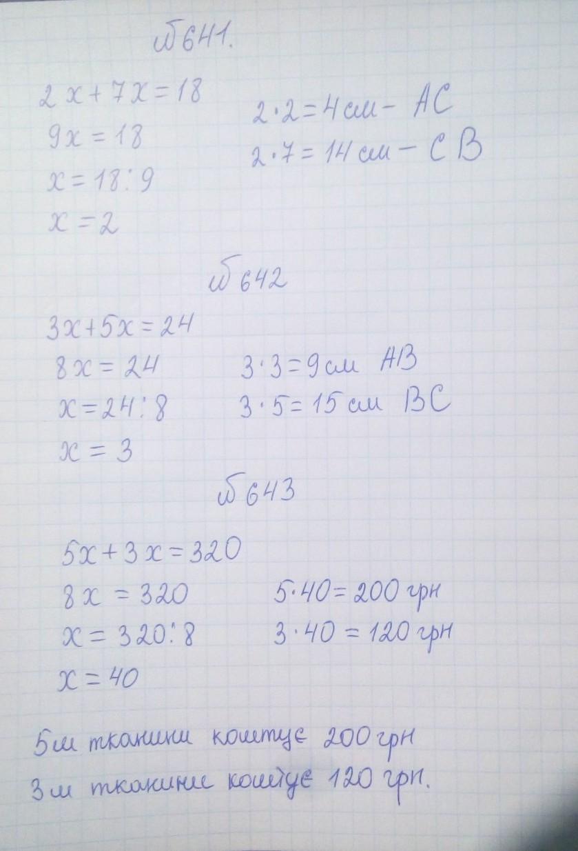 641°. Відрізок АВ завдовжки 18 см точкою С поділено у відношен- ні 2:7. Знайдіть довжину кожної частини. 642°. Відрізок AC завдовжки 24 см точкою В поділено у відношенні 3:5. Знайдіть довжину кожної частини. 643°. Два відрізи однакової тканини коштують 320 грн. Довжина першого відрізу становить 5 м, а другого — 3 м. Скільки коштує кожний відріз тканини? - тата, това от ITIKA ее UAY Хелп ми