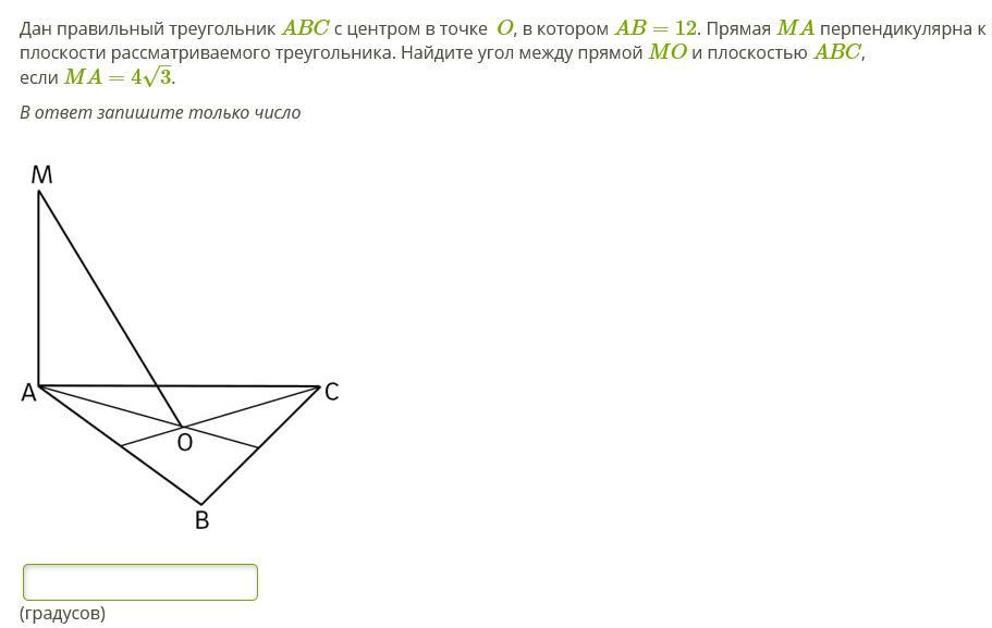 MA перпендикулярна плоскости ABC и любой прямой в этой плоскости, ∠MAO=90°