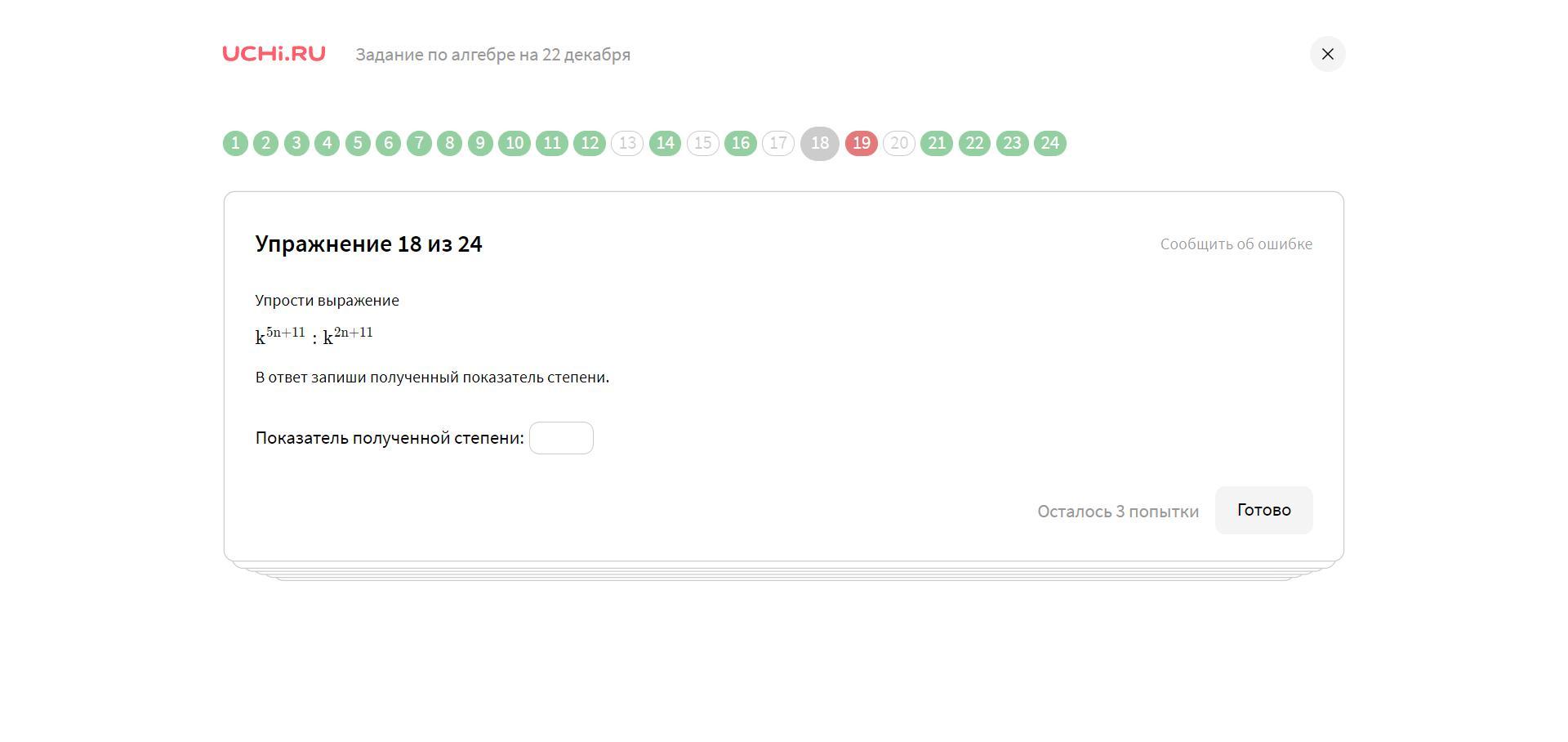18. k⁵ⁿ⁺¹¹ : k²ⁿ⁺¹¹ = k⁵ⁿ⁻²ⁿ⁺¹¹⁻¹¹ = k³ⁿ;