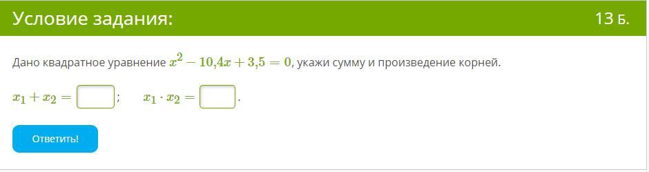 Дано квадратное уравнение x2−10,4x+3,5=0, укажи сумму и произведение корней.