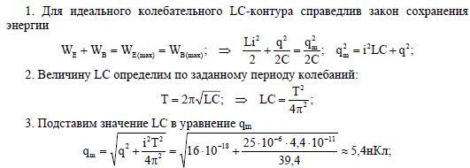 В процессе колебаний в идеальном колебательном контуре в момент времени t заряд конденсатора q = 4 · 10-9 Кл, а сила электрического тока в катушке равна I = 3 мА. Период колебаний Т = 6,28 · 10-6 с. Найдите амплитуду колебаний заряда.