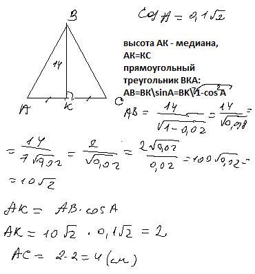 В равнобедренном треугольнике ABC с основанием АC высота, проведённая к основанию, равна 14, a cos угла A — 0,1√2. Найдите Длину АC.
