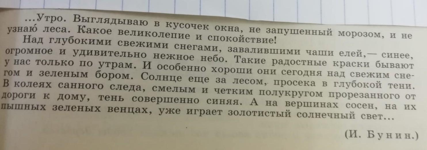 Ответ:Утро(подлежащее, предложение односоставное). Выглядываю(сказуемое, односоставное предложение) в кусочек окна,не запушенный морозом, и не узнаю(сказуемое) леса. Какое великолепие(подлежащее, односоставное предложение) и спокойствие(подлежащее)!