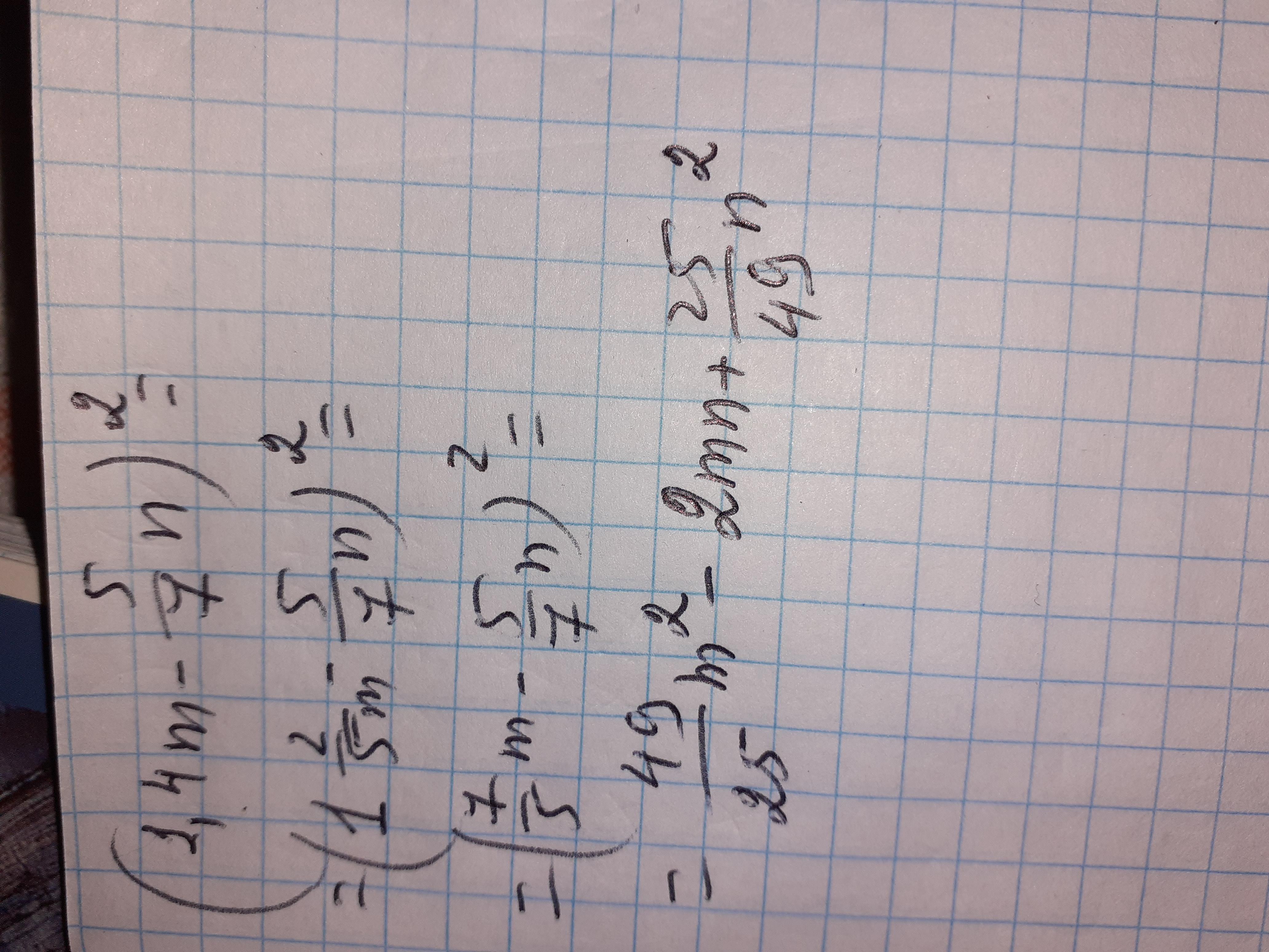 (1,4m-5/7n)² = (1,4m)²-2×1,4m×5/7n+ (5/7n)² = 1,96m²-2mn+25/49n²