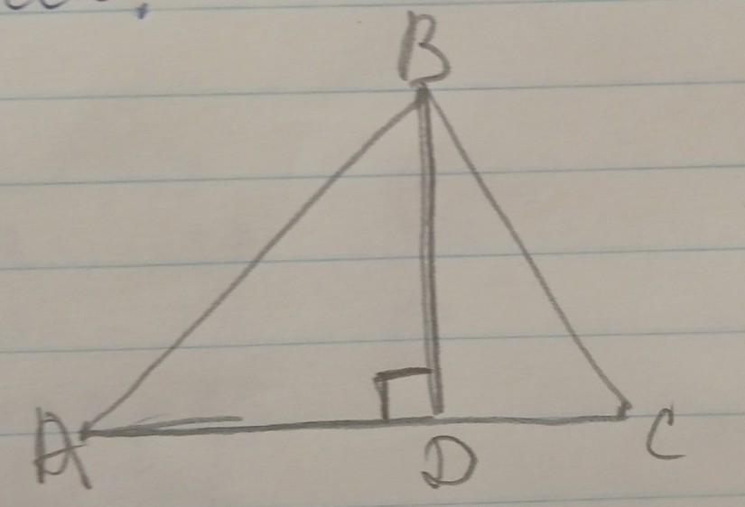 У трикутнику АВС відрізок ВD є висотою.Яка з наведених рівностей випливає з цієї умови?А) АВ=ВС;Б) Кут ВАD=90°;В)АD=DC;Г)кут АDB=90°.Необхідно зробити з розв'язанням.