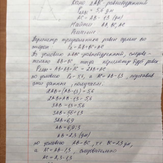 периметр равнобедренного треугольника равен 5,6 дм, основание меньше боковой стороны на 1,3дм Найдите стороны равнобедренного треугольника. ‼️Обязательно дано писать и решение с пояснениями‼️