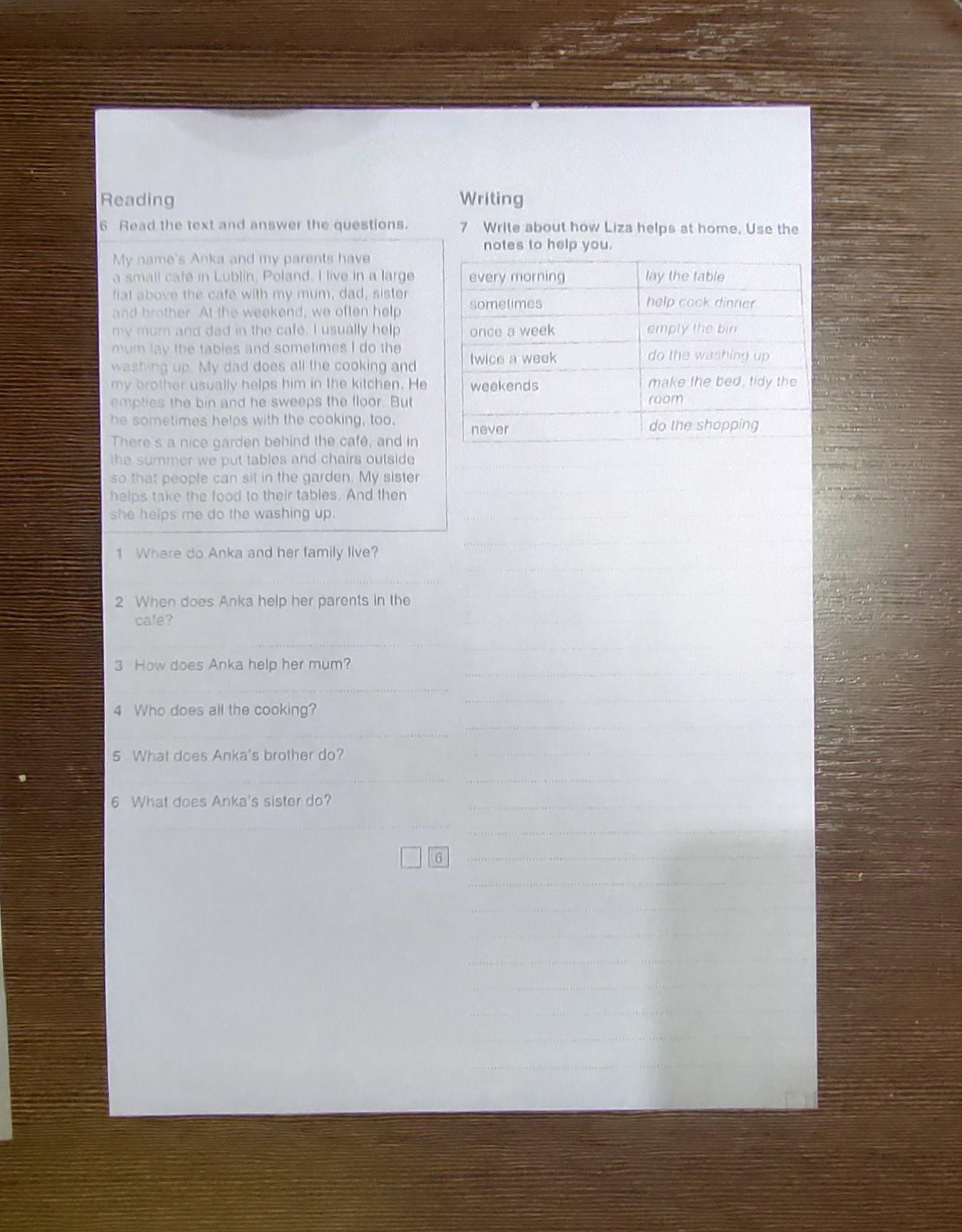 Liza helps at home a lot. Every morning she lays the table. Sometimes she helps to cook the dinner. She empties the bin once a week. She also does the washing up twice a week. At the weekends, she makes the bed and tidies the room. But Liza never does the shopping.