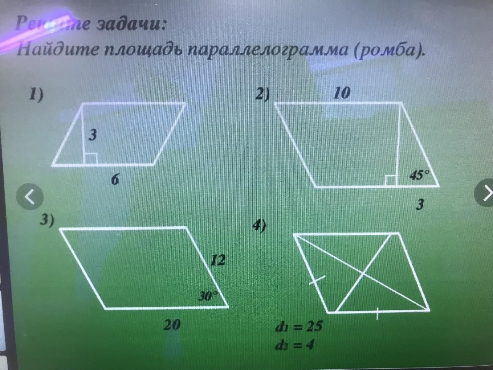 4) Данная фигура - ромб, так как все стороны равны(2 стороны по условию, противоположные равны, так как параллелограмм по условию), S=1/2*d1*d2=50