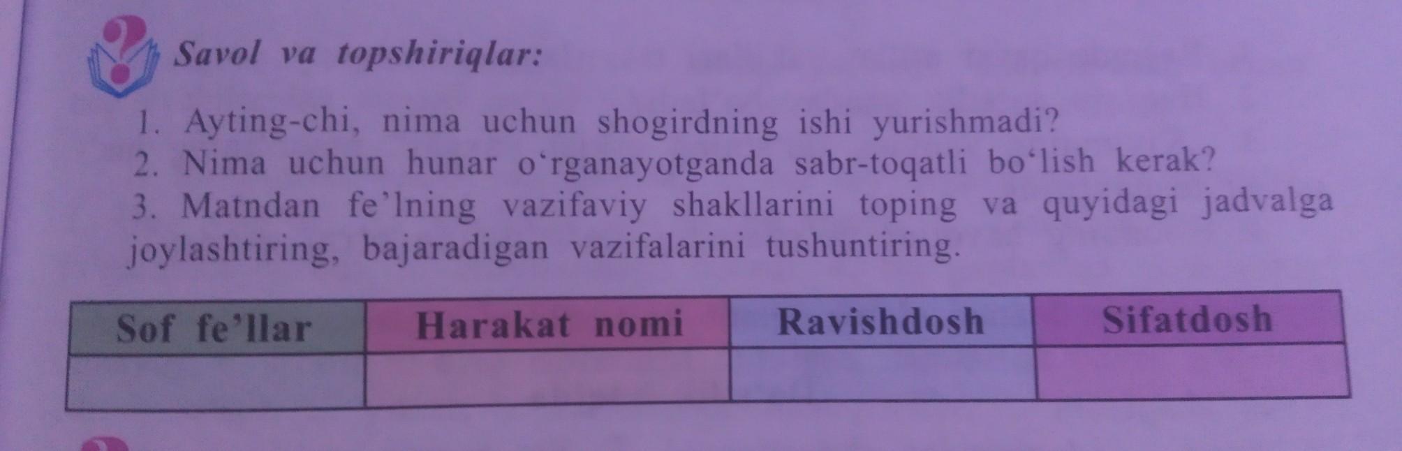 3. Matndan fe'lning vazifaviy shakllarini toping va quyidagi jadvalga joylashtiring, bajaradigan vazifalarini tushuntiring.