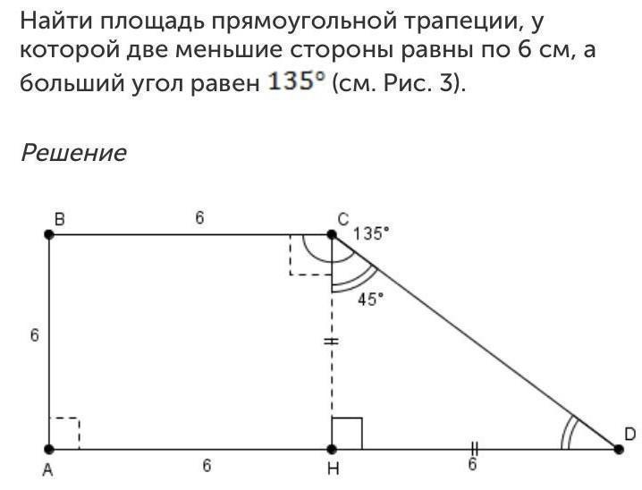 Найдите площадь прямоугольной трапеции у которой две стороны равны по 6 см а больший угол равен 135°