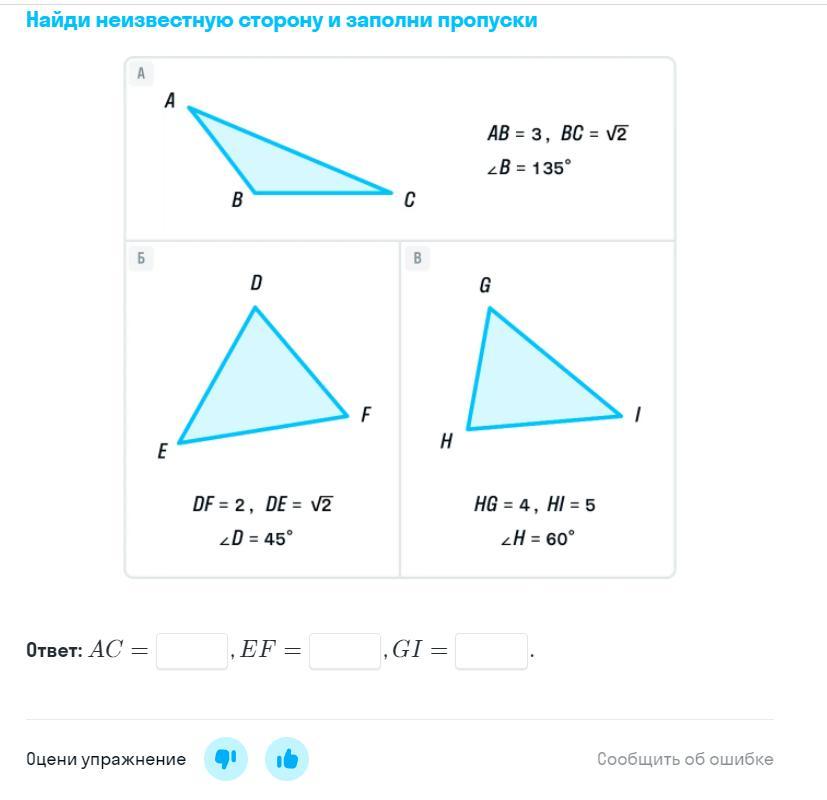 А) b=√(a²+c²-2ac*cos135*) = √((√2)²+3² - 2*3√2*(-√2/2))=√(2+9+6√2+√2/2)= =√20.19=4.5.