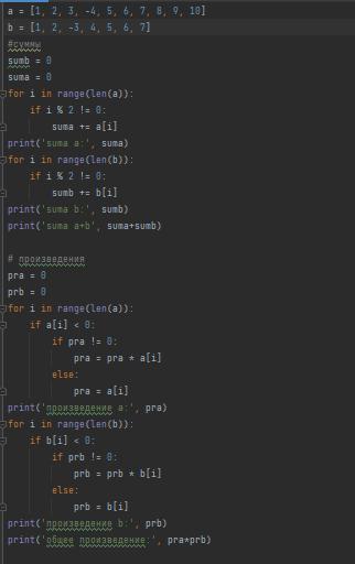 Заданы два одномерных массива А(10) и В(7). Составить программу подсчёта суммы элементов с нечётными индексами и произведения отрицательных элементов в массивах(Питон)