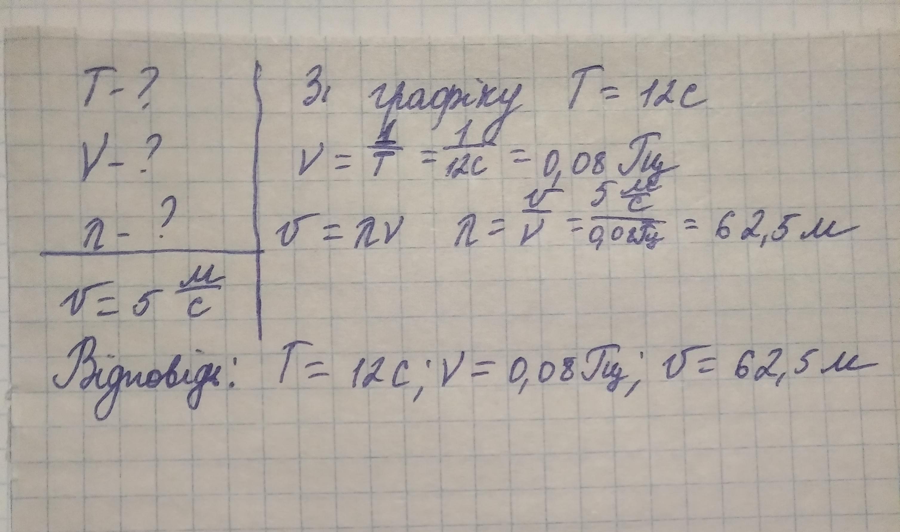за графіком коливань джерела механічної хвилі визначає період коливань і частоту хвилі. Якою є довжина хвилі, якщо хвиля поширюється зі швидкістю 5 м/с