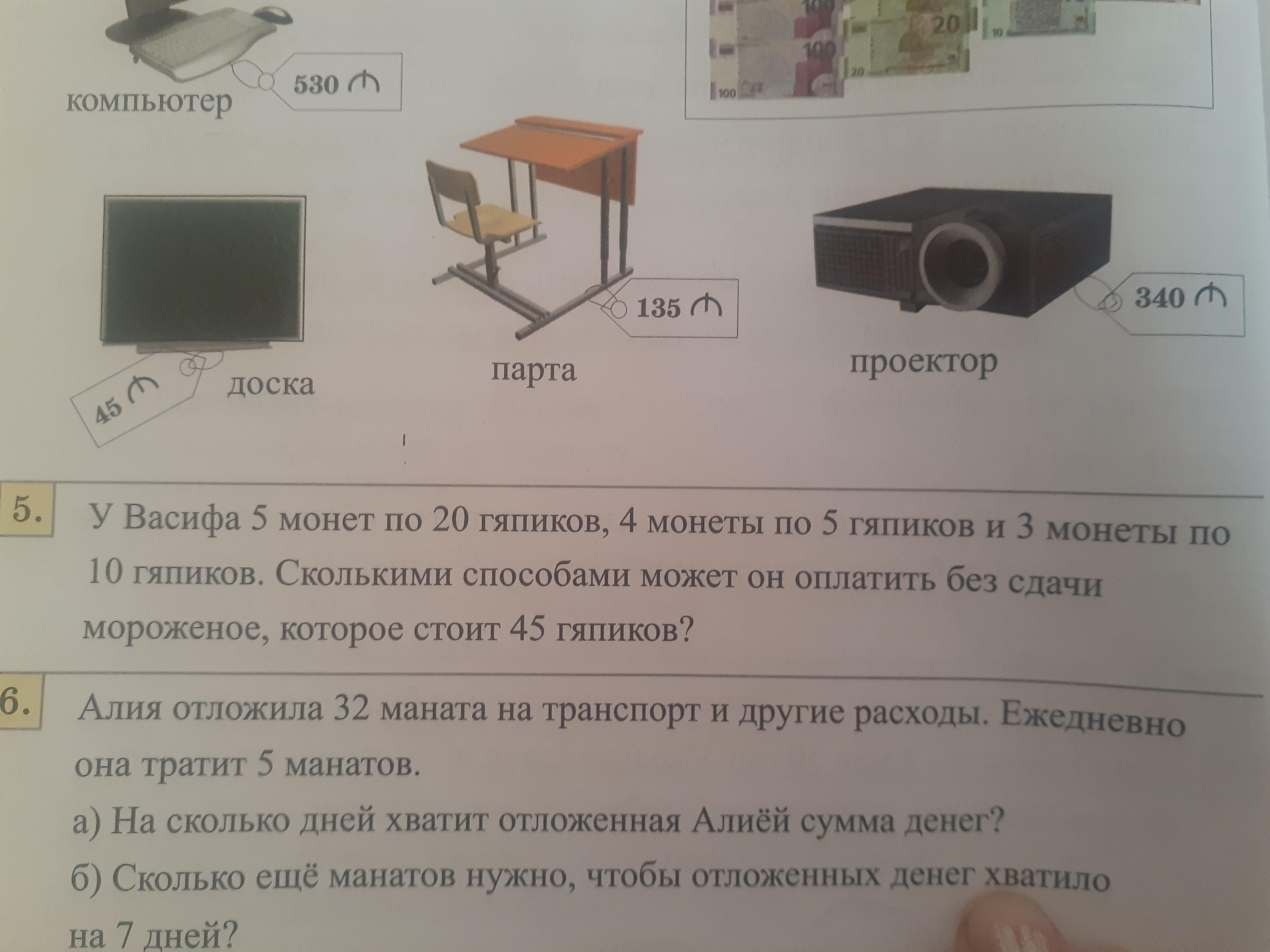 Берем 3 монеты номиналом 10 гяпиков и 3 монеты номиналом 5 гяпиков.