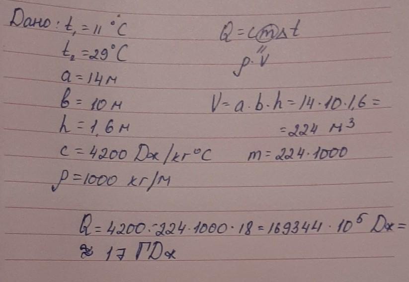 Определи, какое количество теплоты пойдёт на нагревание воды от 15°C до 29°C в бассейне, длина которого — 10 м, ширина — 5 м и глубина — 1,6 м. Удельная теплоёмкость воды равна 4200 Дж/(кг·°C), плотность воды — 1000 кг/м³.