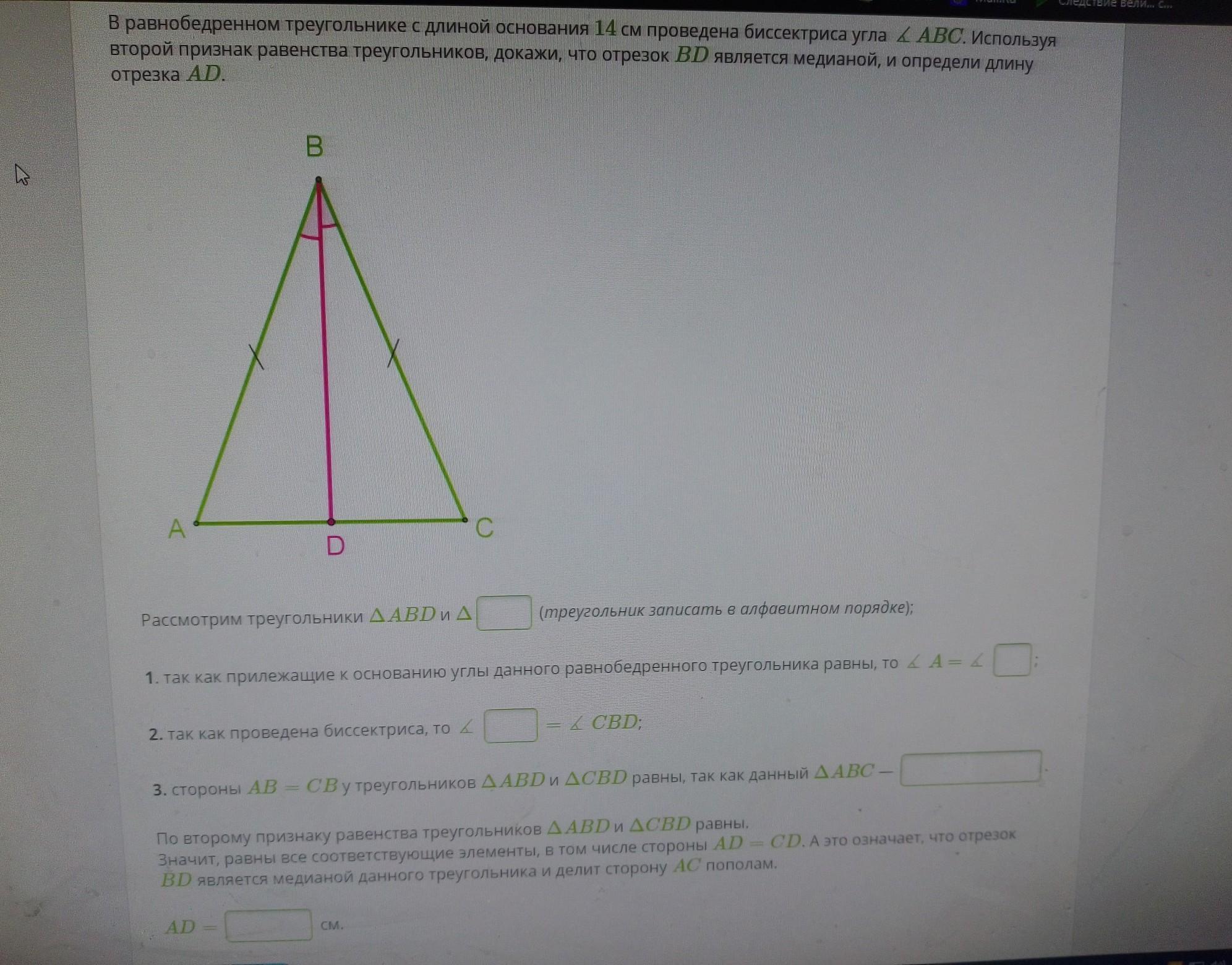 стороныАВ=СВ у ΔАВД и ΔСВД равны. так как данный ΔАВС равнобедренный