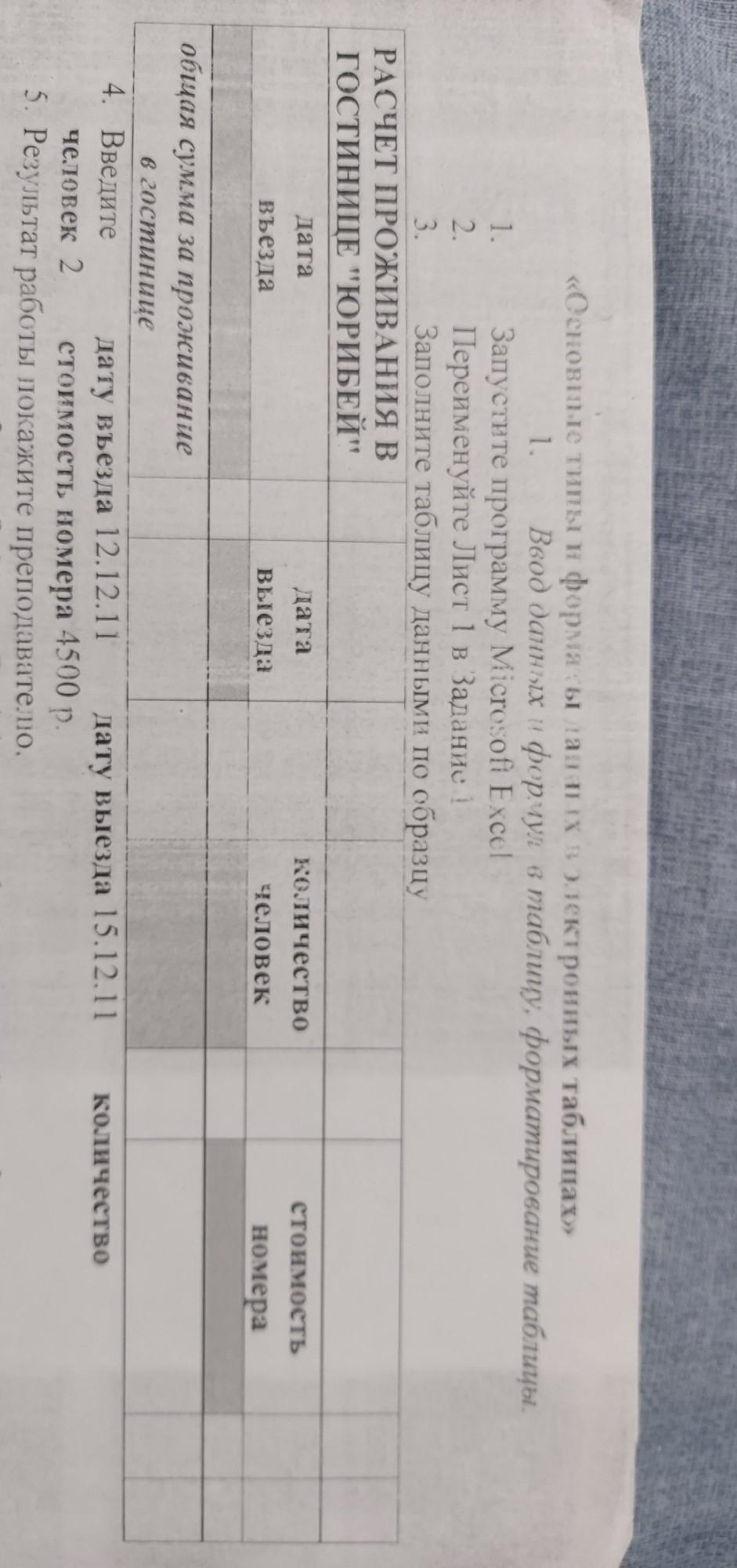 Задание 1 Ввод данных и формул в таблицу, форматирование таблицы. 1. Запустите программу Microsoft Excel 2. Переименуйте Лист 1 в Задание 1 3. Заполните таблицу данными по образцу РАСЧЕТ ПРОЖИВАНИЯ В ГОСТИНИЦЕ "ЮРИБЕЙ" дата въезда дата выезда количество человек стоимость номера общая сумма за проживание в гостинице