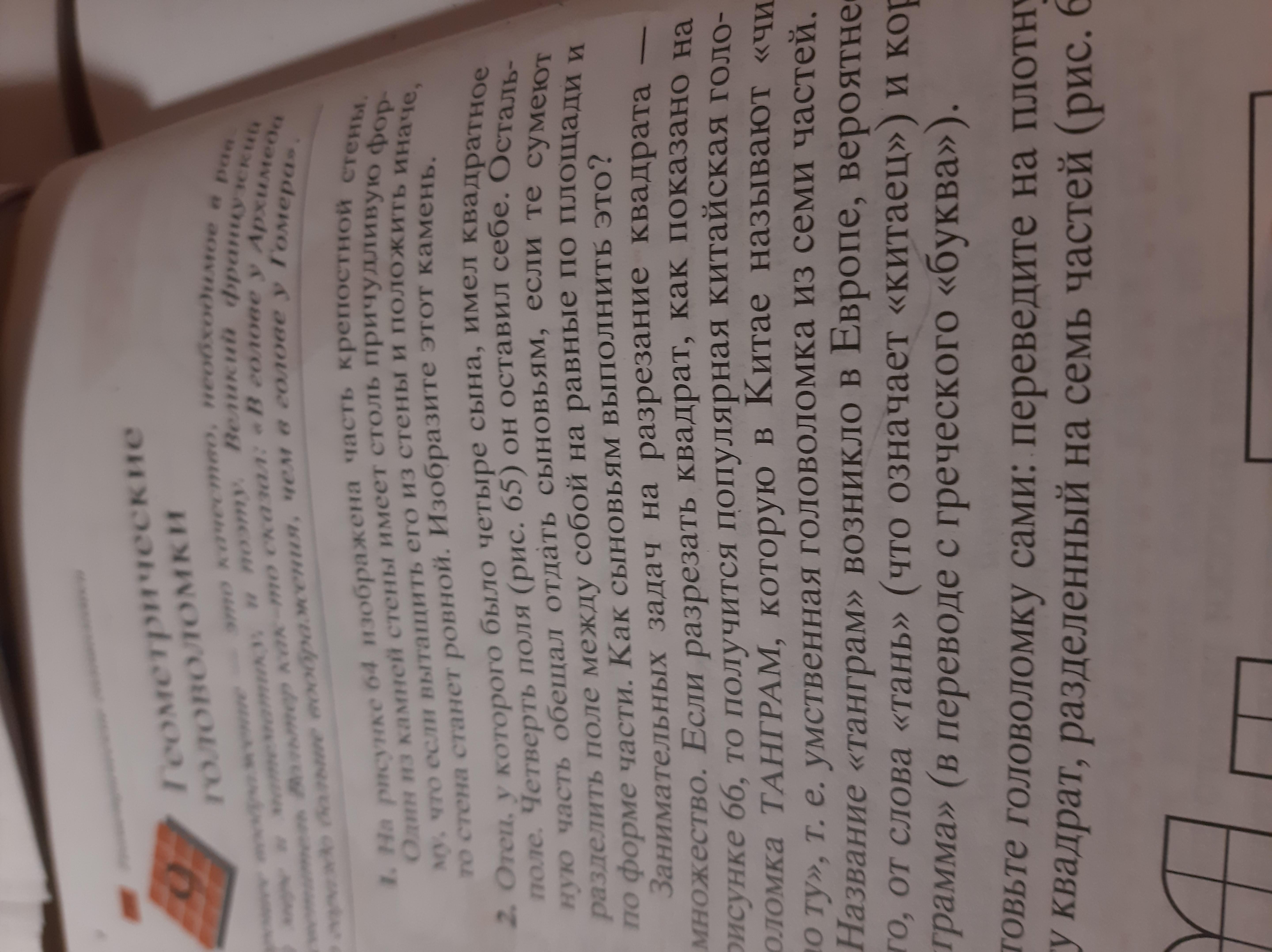 Помогите решить задачу по наглядной геометрии 5 класс:Отец, у которого было четыре сына имел квадратное поле. Четверть поля он оставил себе. Остальную часть обещал отдать сыновьям, если те сумеют разделить поле между собой на равные по площади и по форме части. Как сыновьям выполнить это? Задание номер 2