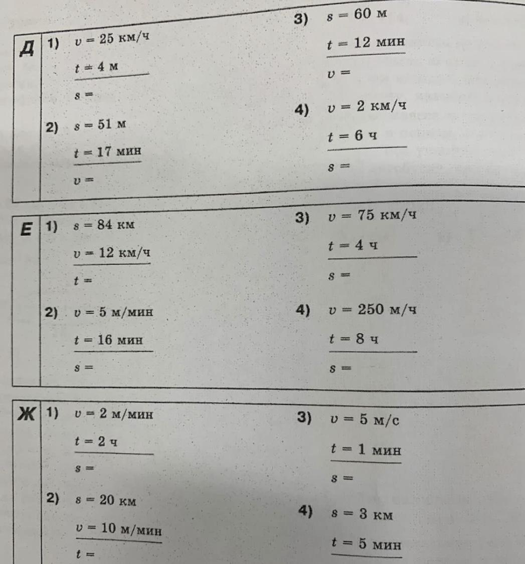 В заданиях под буквой Ж нам надо перевести их в одну систему измерений нам даны метры в минуту и часы, тогда мы можем перевести часы в минуты и считать спокойно