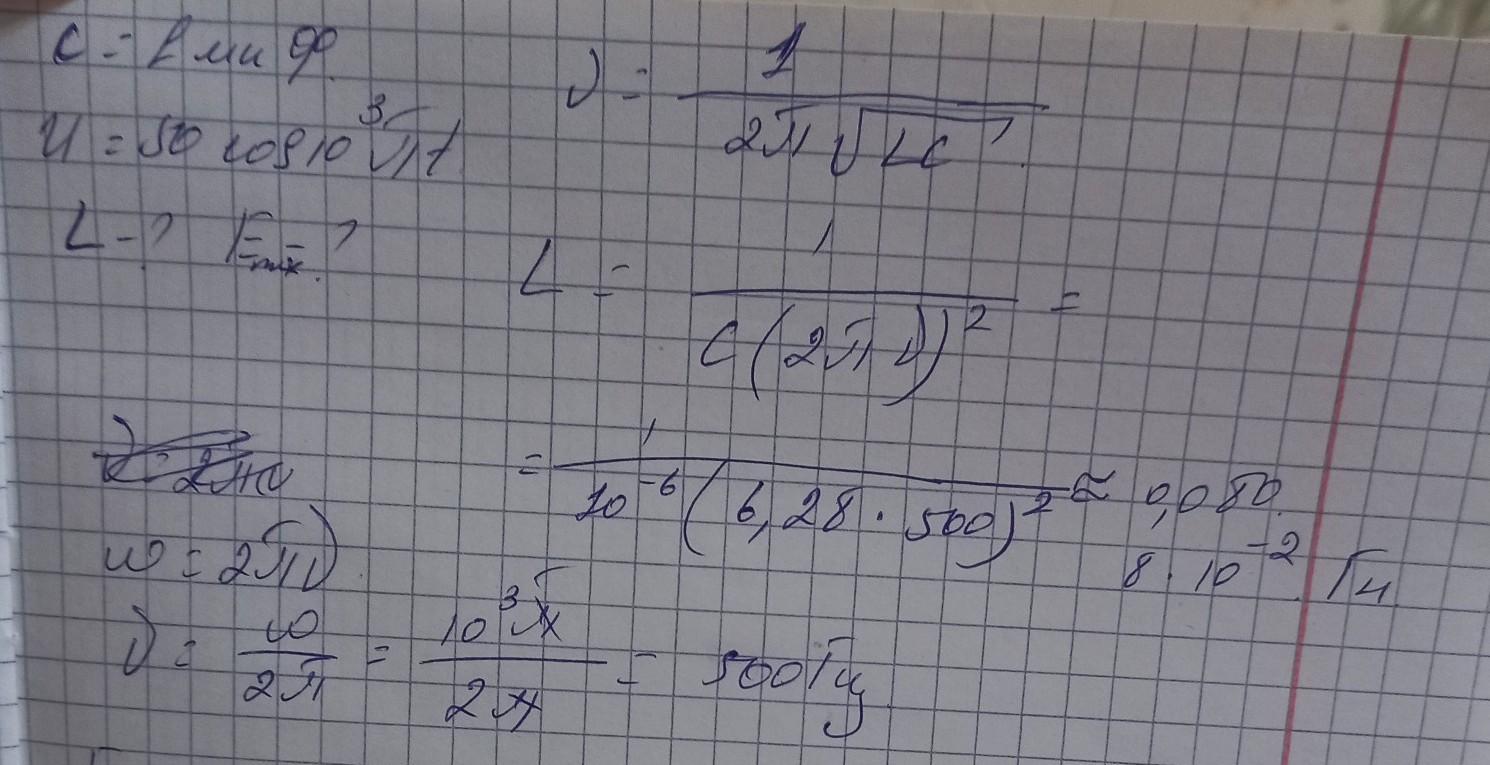Емкость конденсатора в колебательном контуре равна 1 мкФ, а напряжение в цепи меняется по закону u = 50cos10^3Пt. Найти индуктивность контура. Чему равна максимальная энергия электрического поля в контуре?