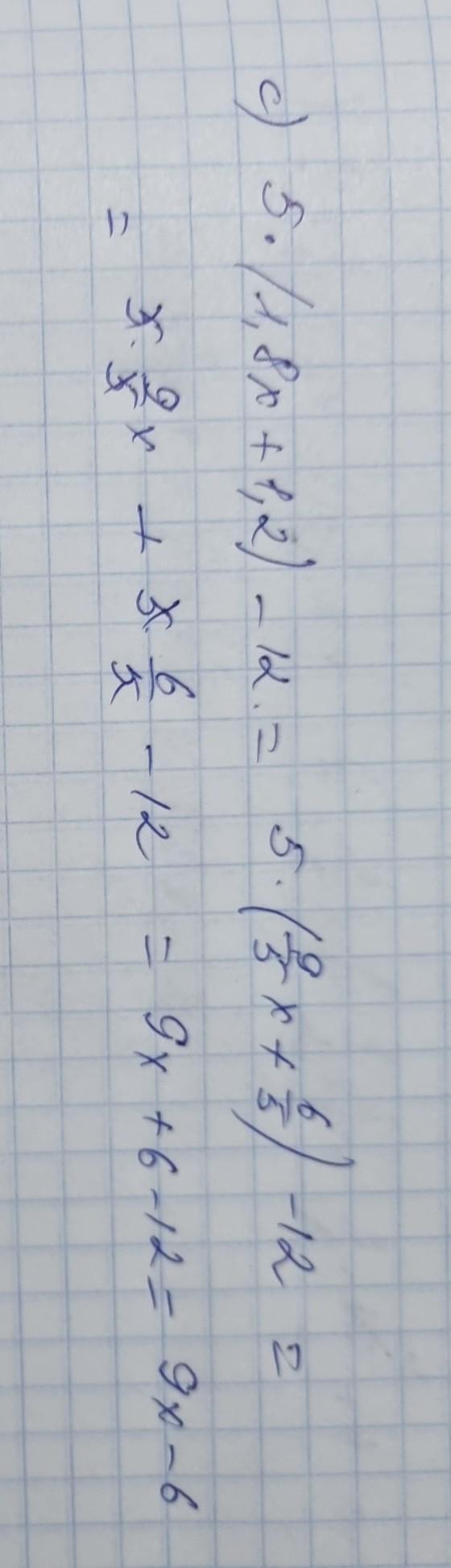 5 * (1,8х + 1,2) -12 = 5*1,8х+5*1,2-12= 9х+6-12=9х-6