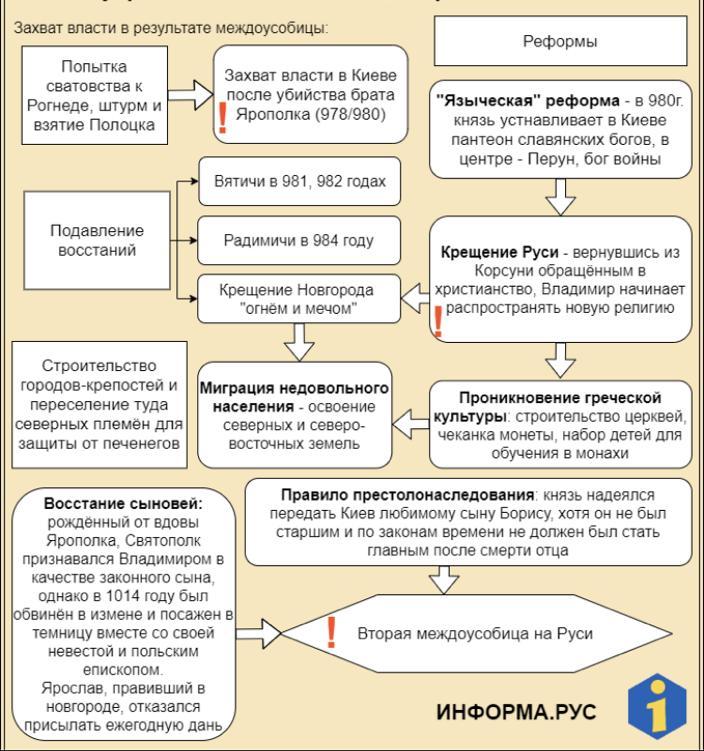 Владимир провел несколько реформ:· административная реформа (земли Руси передавались 12 сыновьям князя). На смену родоплеменному разделу общества пришел территориальный;· военная реформа. Ликвидированы племенные военные объединения. Военная система была объединена с системой феодального землевладения. Владимир раздавал «мужам лучшим» земельные владения в приграничных районах Руси, обязывая их к воинской службе;· религиозная реформа. Понимая, что в централизованном государстве в религиозной сфере должен господствовать монотеизм в конце 80-х гг. Х ст. Владимир решает ввести христианство; Драматические события, связанные с введением христианства, которые происходили в 988 – 989 гг. летописцем спрессованы в один год – 988 г. Реально христианизация Руси продолжалась несколько столетий.