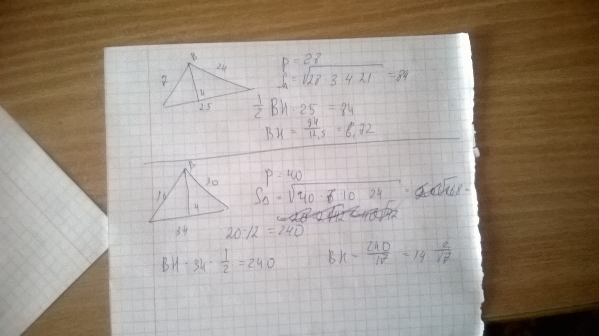 Помогите с последними 2 задачами!!!! 1- Найдите наибольшую и наименьшую из высот ртеугольника , стороны которого равны 8 см , 10 см и 12 см . 2- Найдите наименьшую из высот треугольника со сторонами : 1) 17,65,80 2) 8,6,4 3) 24,25,7 4) 30,34,16