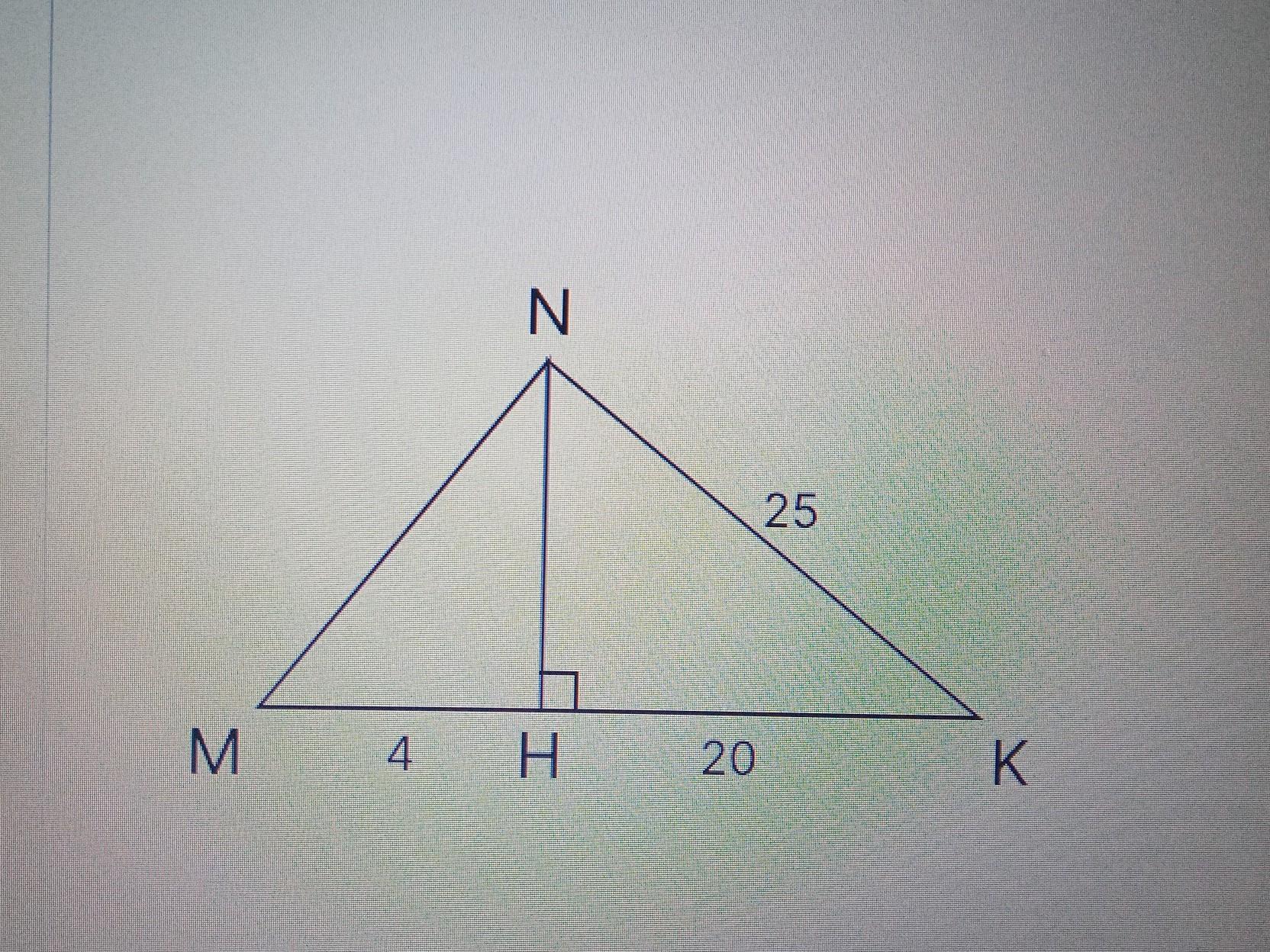 найдем высоту по Пифагору NH=√(25²-20²)=√(625-400)=√225=15