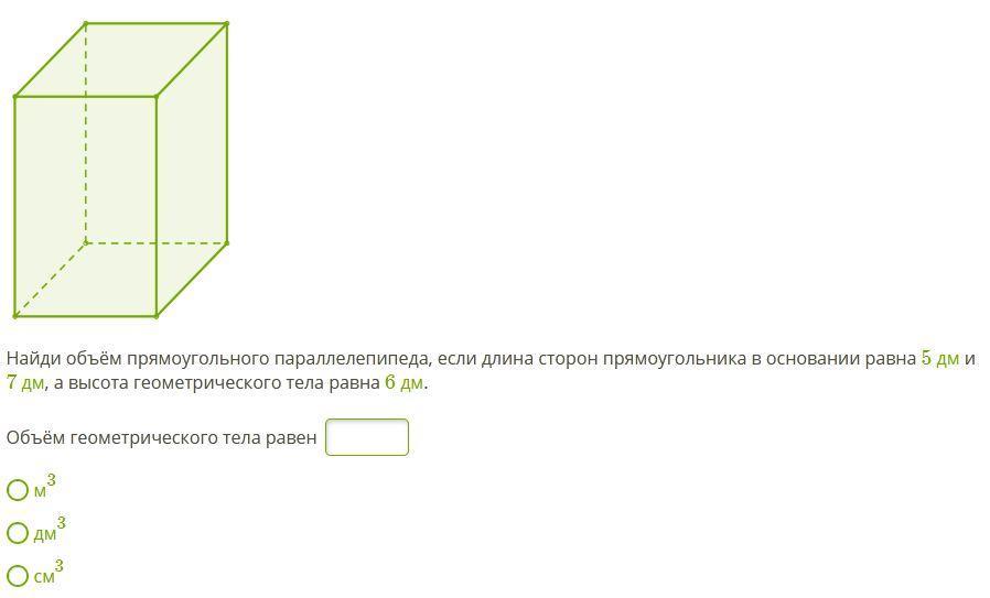 Найди объём прямоугольного параллелепипеда, если длина сторон прямоугольника в основании равна 5 дм и 7 дм, а высота геометрического тела равна 6 дм.
