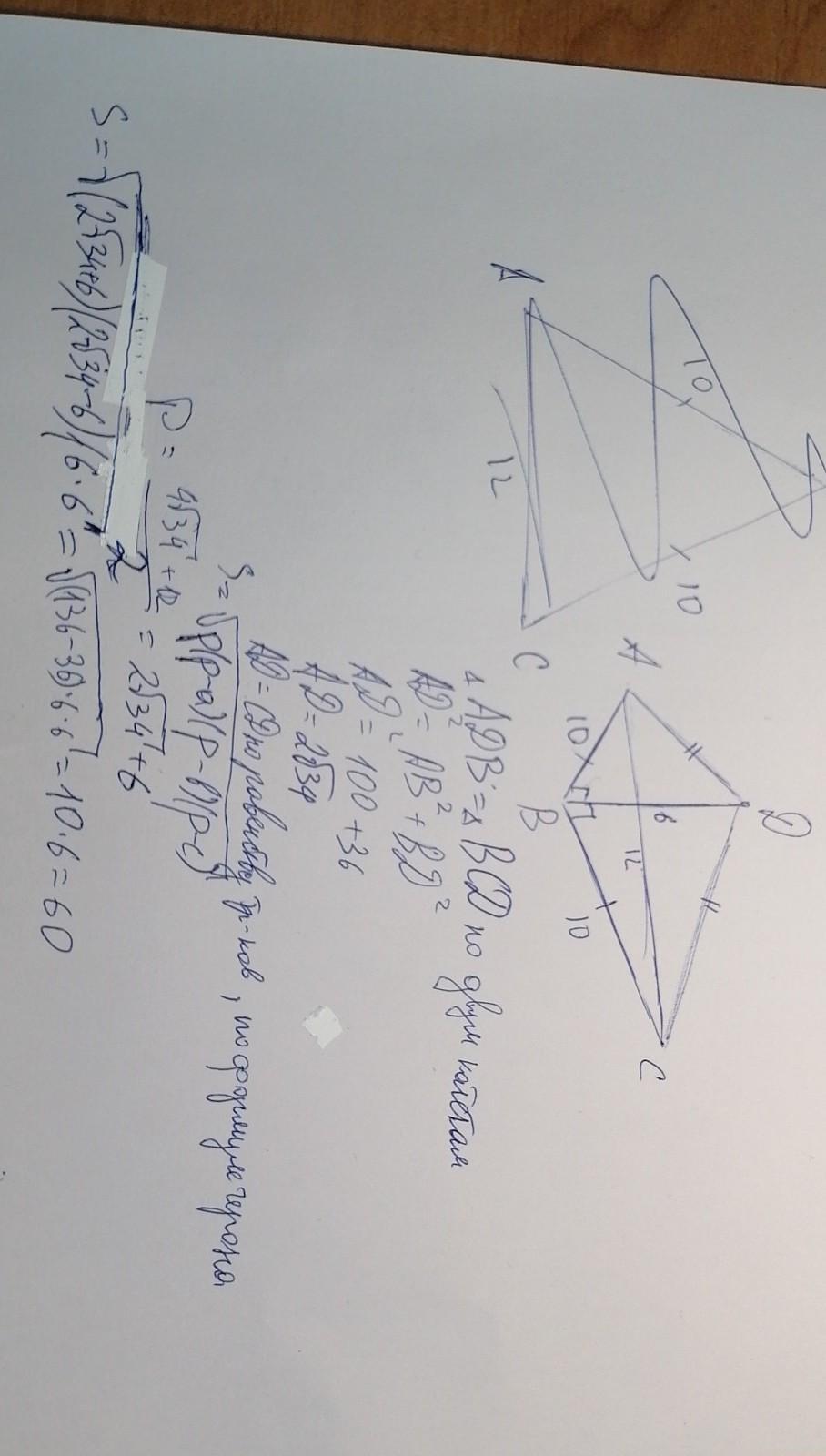 в равнобедренном треуголь АВС боковые стороны АВ и ВС равны 10 см, а сторона АС равна 12 см. отрезок ВD перпендикулярен плоскости треугольника и равен 6 см. найдите площадь треугольника ADC.