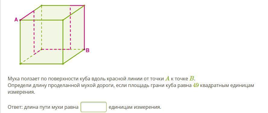 Определи длину проделанной мухой дороги, если площадь грани куба равна 49 квадратным единицам измерения.