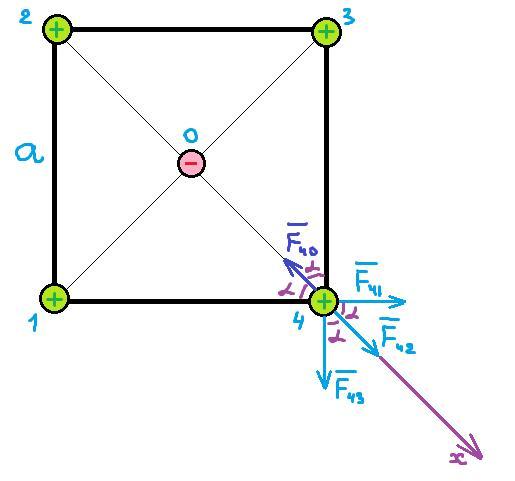 Если система находится в равновесии, то векторная сумма сил, действующих на каждый из зарядов равна 0. Заметим, что поскольку картинка симметрична относительно центрального заряда, то выбирать его для рассмотрения смысла нет. Выберем для рассмотрения один из зарядов, расположенных в вершинах квадрата, например, № 4.