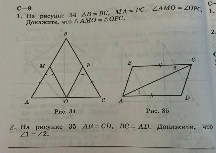 1) АМ=РС и МО=РО следовательно угол АМО= углу ОРС, а значит треугольники равны