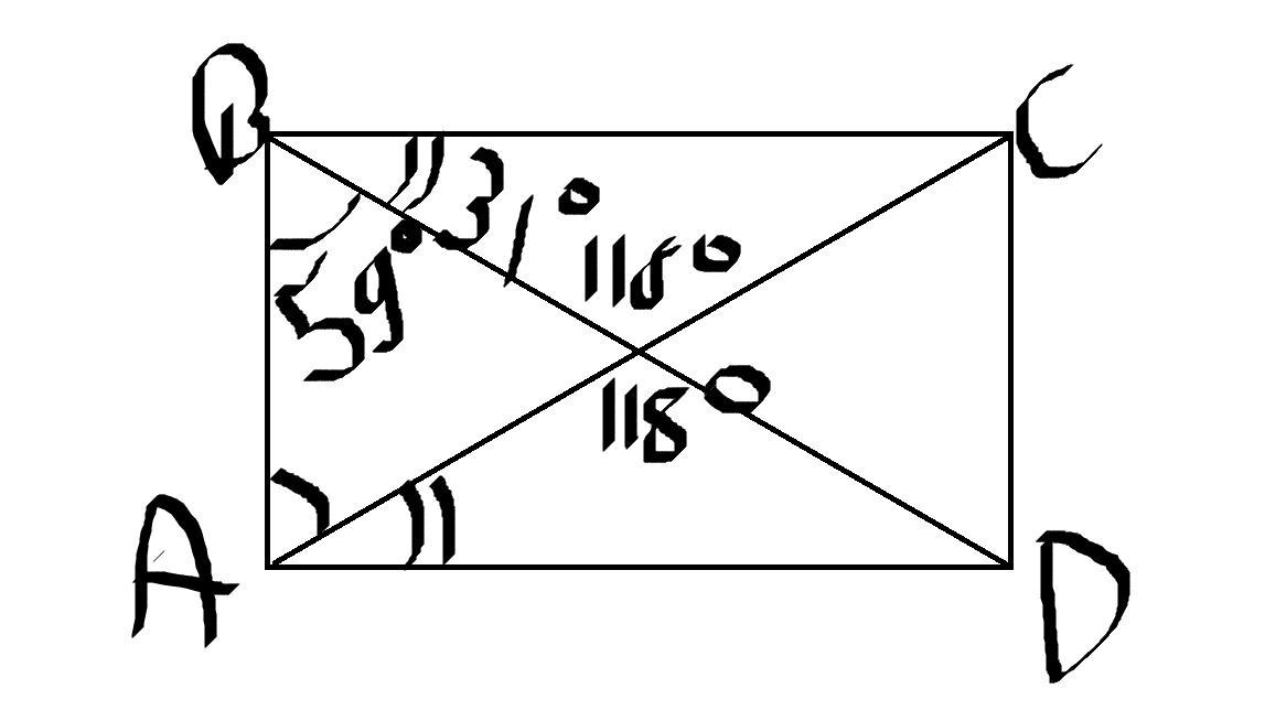 No 4. Діагоналі прямокутника утворили кут 118°. Найти кути, які утворюють діагоналі зі сторонами прямокутника.