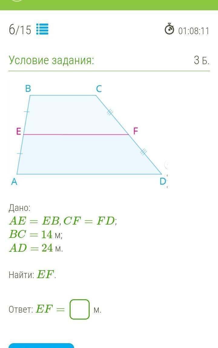 по условию дана средняя линия трапеции АВСD, при условии, что ВС ║АD, по свойству средней линии ЕF=(BC+AD)/2=(14+24)/2=7+12=19/м/