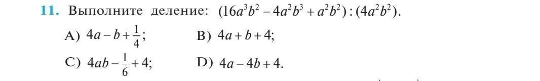 (16a³b² - 4a²b³ + a²b²) : (4a²b²) = a²b²(16a - 4b + 1) : (4a²b²) = (16a - 4b + 1) : 4 = 4a - b + 1/4
