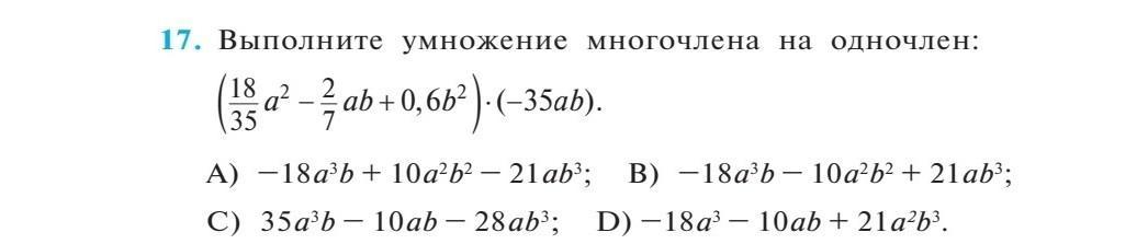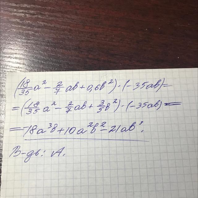 (18/35a² - 2/7ab + 0.6b²) * (-35ab) = -18/35a²* 35ab + 2/7ab * 35ab - 0.6b² * 35ab = -18a³b + 10a²b² - 21ab³