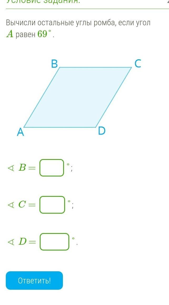 Противоположные углы ромба равны, значит, ∠А=∠С=69°, а углы, прилежащие к одной стороне, например, АВ, в сумме составляют 180°, поэтому ∠В=180°-∠А=180°-69°=111°, и опять же противоположные углы ромба равны, значит, ∠В=∠D=111°