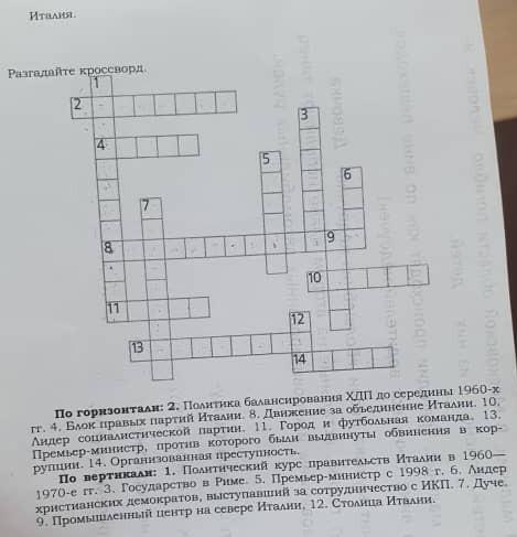 По вертикали: 1. левоцентризм, 3. Ватикан, 5. ДАлема, 6. Моро, 7. Муссолини, 9. Турин, 12. Рим.