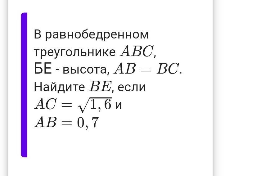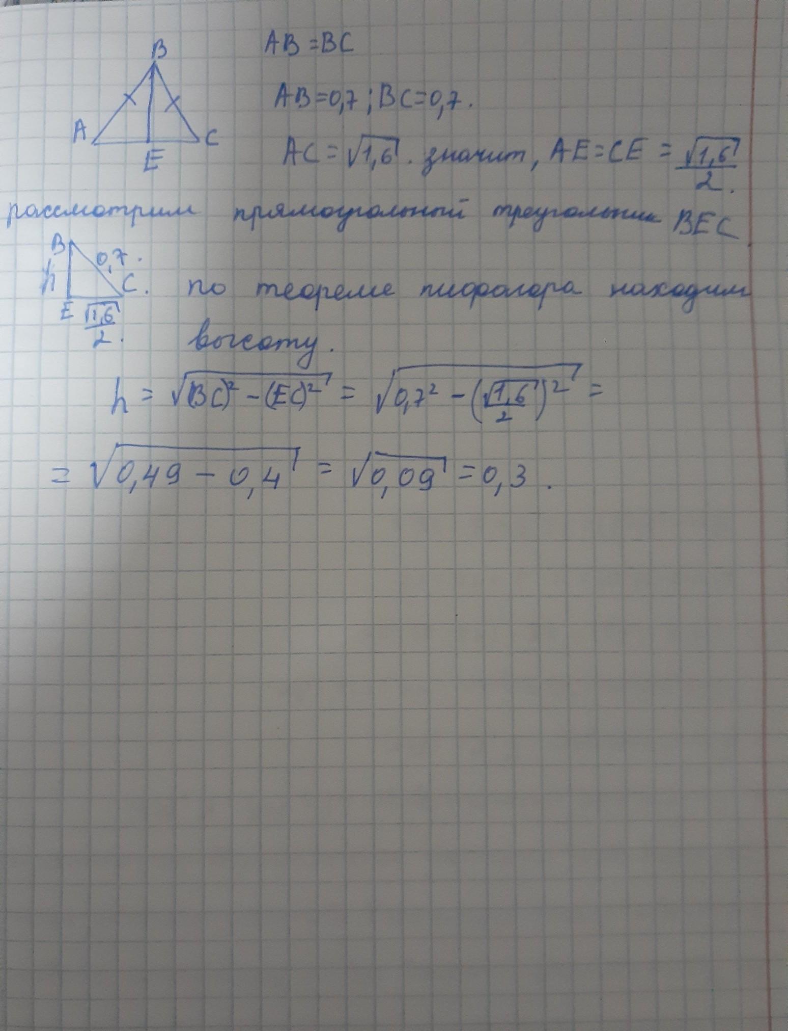 h=корень(вс²-ес²)= корень (0,7² - (корень 1,6²/2²))= корень(0.49-0.4)= корень (0.09)= 0.3