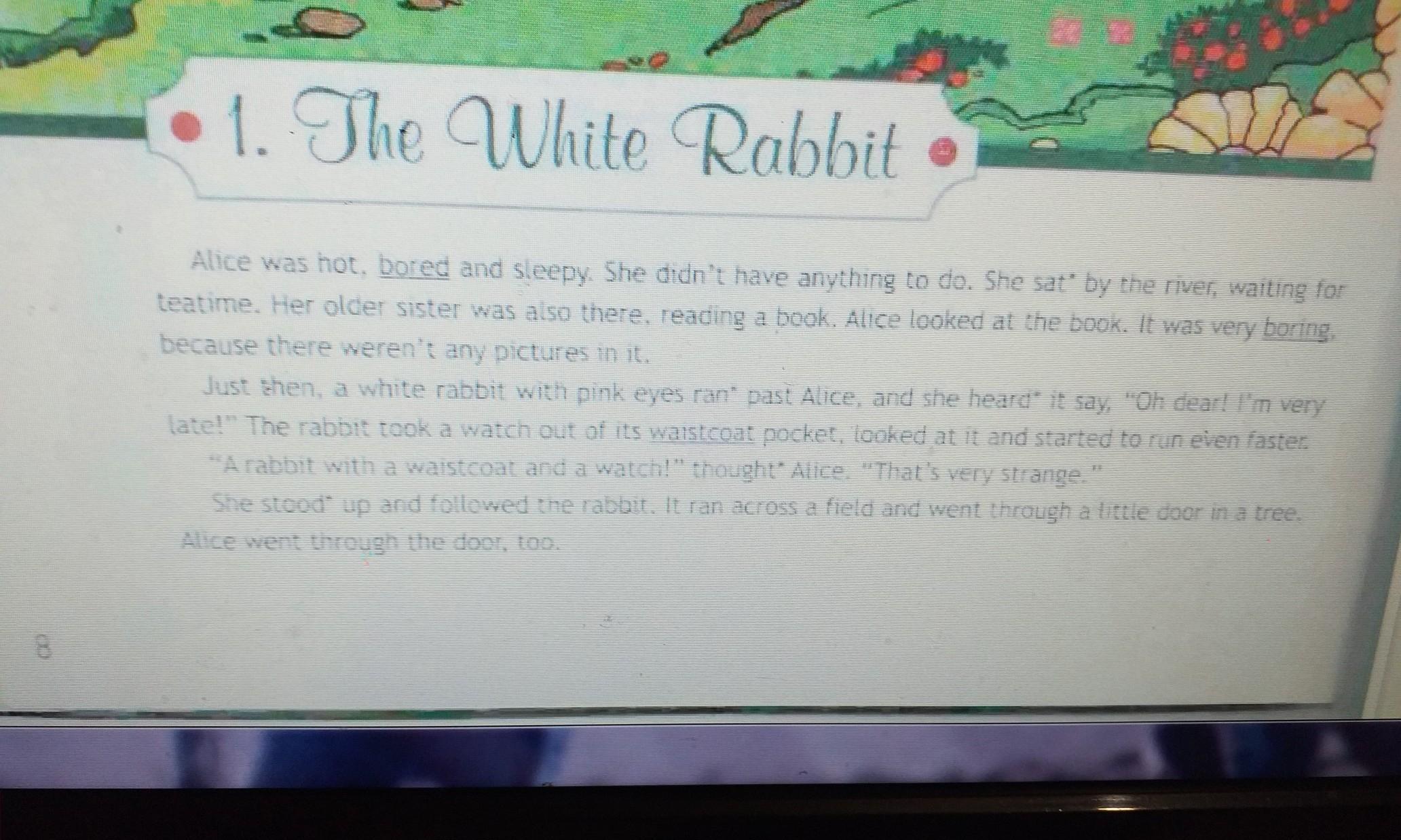 Алисе было жарко, скучно и сонно. Ей было нечего делать. Она сидела «у реки, дожидаясь чаепития. Ее старая сестра тоже была там, читала книгу. Алиса посмотрела на книгу. Она была очень родной, потому что в ней не было никаких картинок. мимо Алисы, и она услышала, как он сказал: «О, очень странно. Поклонник Осфилда и мы с маленьким доктором прошли через дверь, чтобы