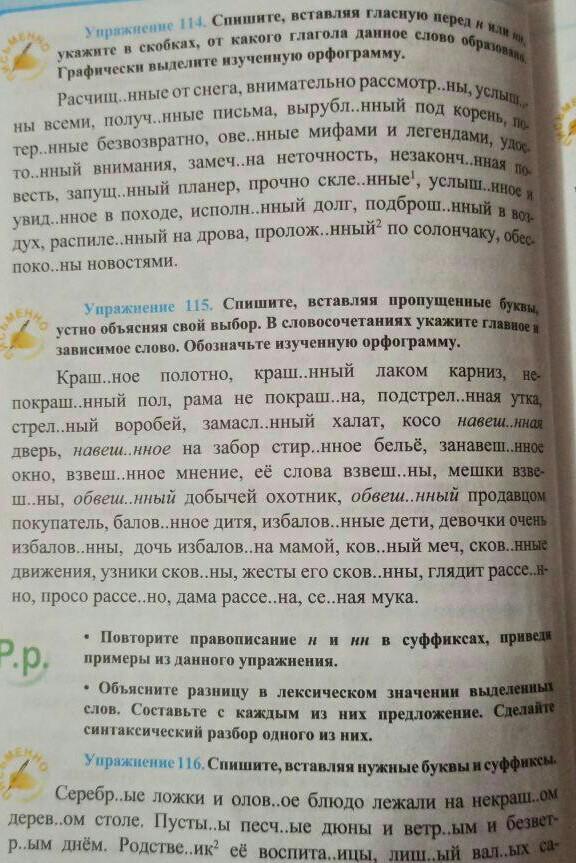 115)Крашеное полотно (от глагола несовершенного вида), крашенный лаком карниз (причастный оборот, образовалось от красить + суффикс -енн-), непокрашенный пол ( образовалось от красить + суффикс -енн-), рама не покрашена (краткое причастие), подстреленная утка (образовалось от подстрелить + суффикс -енн-), стреляный воробей, замасленный халат (зависит от значения), косо навешенная ( образовалось от повесить + суффикс -енн-) дверь, навешенное ( образовалось от вешать + суффикс -енн-) на забор стиранное (суффиксы -а- и -нн-) бельё, занавешенное окно образовалось от завесить + суффикс -енн-) , взвешенное мнение образовалось от взвесить + суффикс -енн-) , её слова взвешены (краткое причастие, по примеру предыдущего), мешки взвешены (по примеру предыдущего), обвешанный добычей охотник, обвеш.анный продавцом покупатель, балованное (от баловать) дитя, избалованные дети, девочки очень избалованны, дочь избалована мамой (отыменное прилагательное), кованый (исключение) меч, скованные движения (от сковать), узники скованы (краткое причастие, по примеру предыдущего), жесты его скованны (краткое отыменное прилагательное), по примеру предыдущего), глядит рассеянно (краткое отыменное прилагательное , просо рассеяно (краткое причастие), дама рассеянна (отым.прил), сеяная мука (краткое причастие)