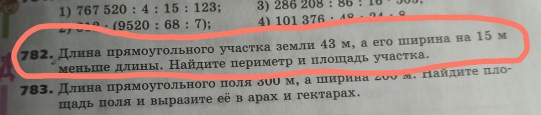 72. Длина прямоугольного участка земли 42 м, а его ширина на 15 и меньше длины. Найдите периметр и площадь участка.