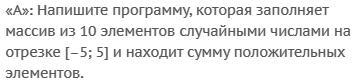 А: Напишите программу, которая заполняет массив из 10 элементов случайными числами на отрезке [-5; 5] и находит сумму положительных элементов.