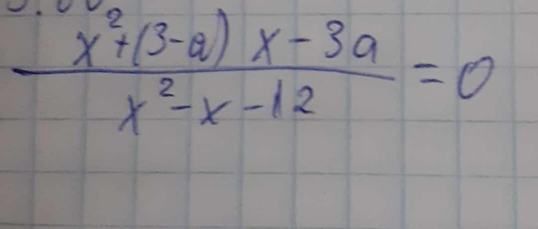 \displaystyle\bf\\\frac{x^{2} +(3-a)x-3a}{x^{2} -x-12} =0\\\\\\\left \{ {{x^{2} +(3-a)x-3a=0} \atop {x^{2} -x-12\neq 0}} \right. \\\\\\\left \{ {{x^{2} +(3-a)x-3a=0} \atop {(x-4)(x+3)\neq 0}} \right.\\\\\\\left \{ {{x^{2} +(3-a)x-3a=0} \atop {x\neq 4 \ ; \ x\neq -3}} \right.\\\\\\x^{2} +(3-a)x-3a=0\\\\\\D=(3-a)^{2} -4\cdot (-3a)=9-6a+a^{2} +12a=a^{2}+6a+9=(a+3)^{2}\\\\\\x_{1} =\frac{-(3-a)+(a+3)}{2} =\frac{-3+a+a+3}{2}=a