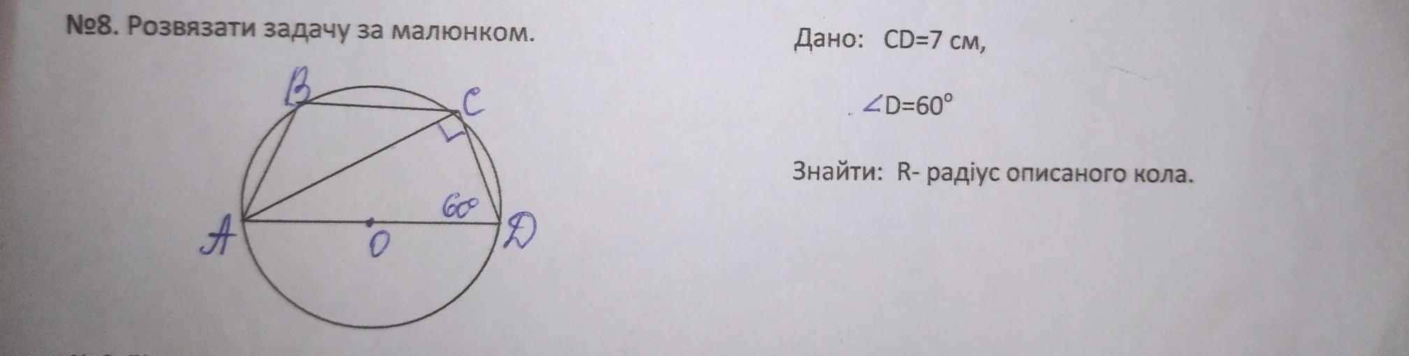 OD=AO=R, в трикутнику ACD, кут С=90, D=60 тоді кут А=30.