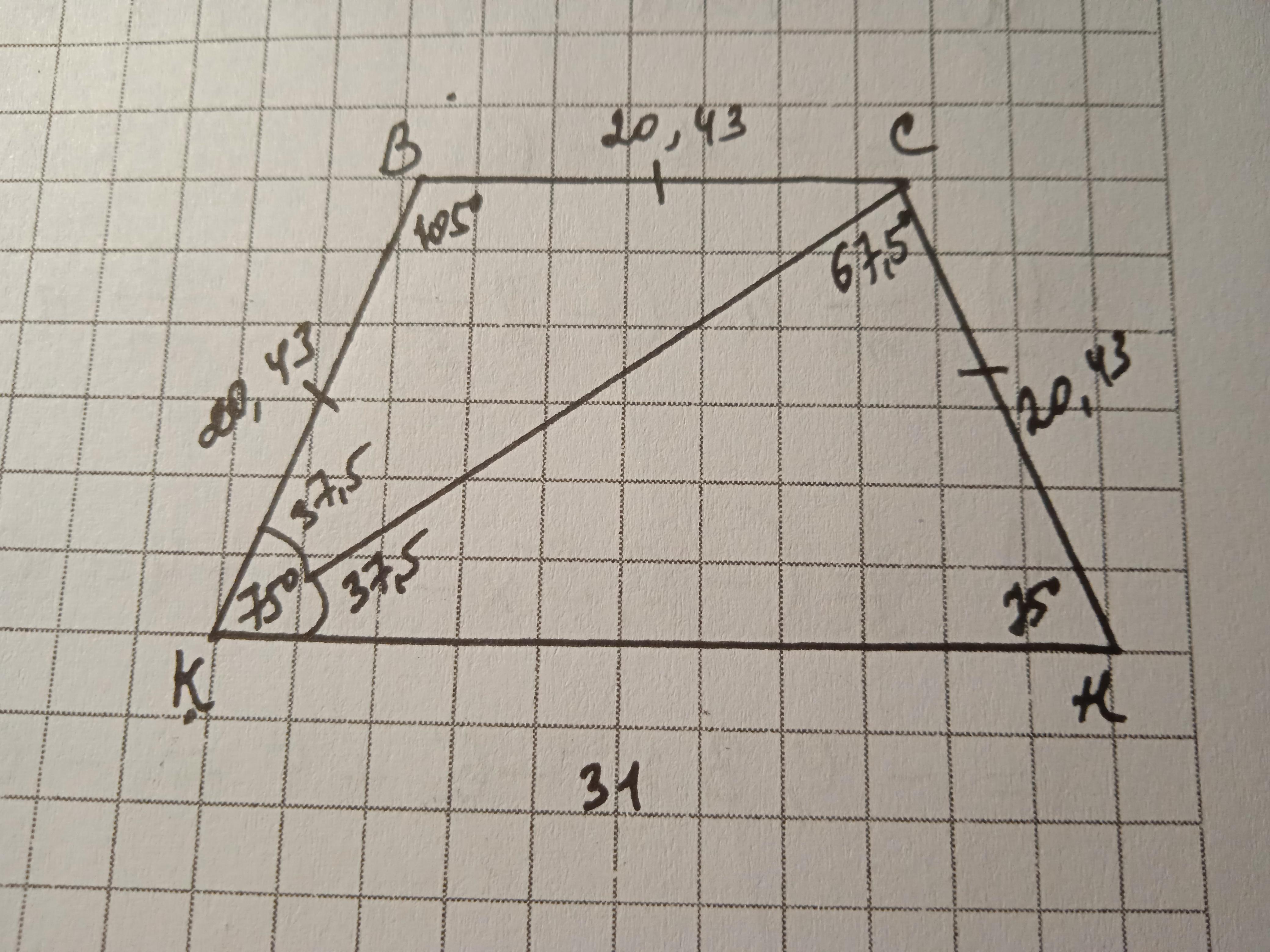 Длинное основание KH равнобедренной трапеции KBCH равно 31 см, короткое основание BC и боковые стороны равны. Определи периметр трапеции, если острый угол трапеции равен 75°.