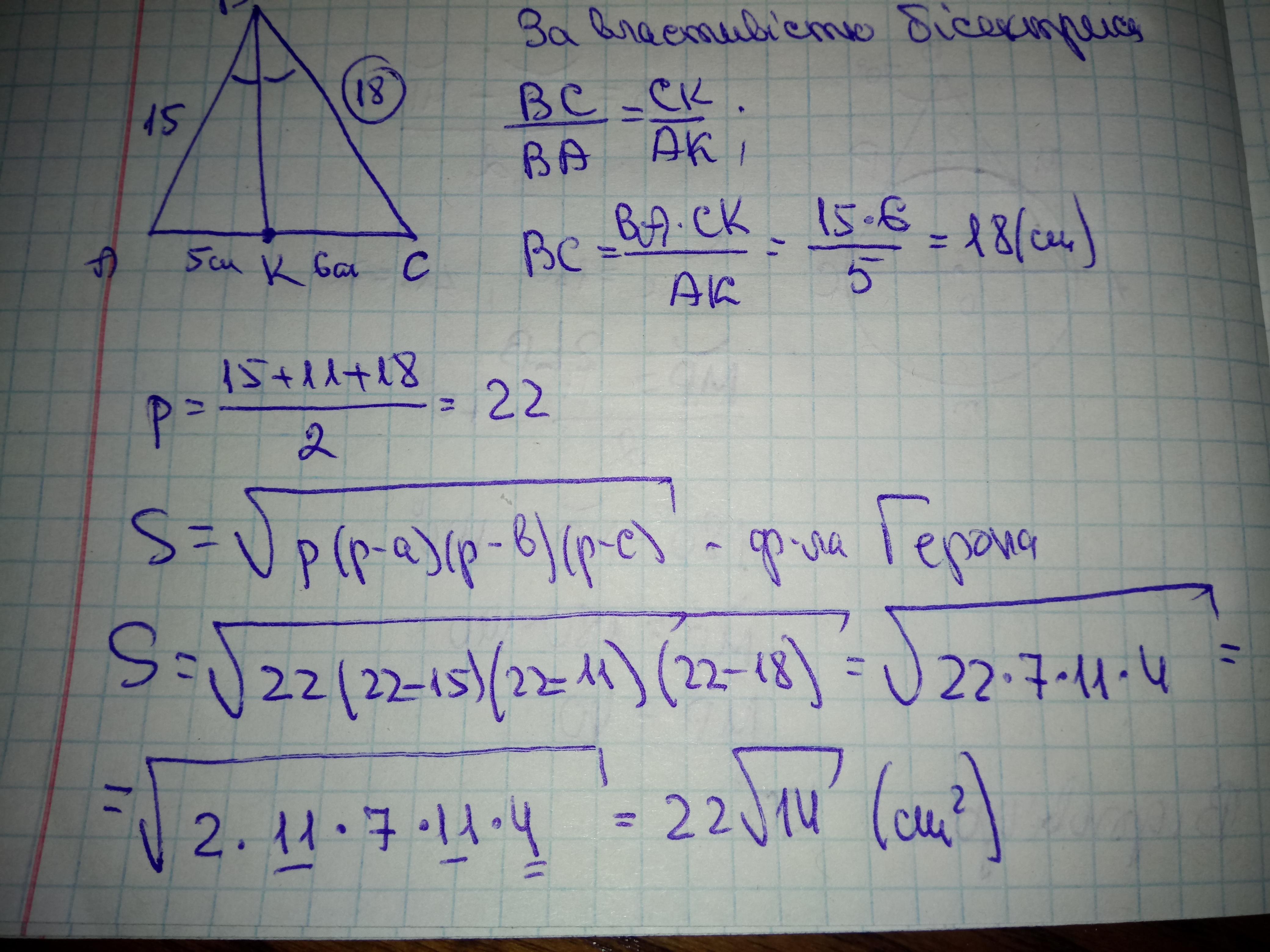 Бісектриса трикутника ділить його сторону на відрізки 5 та 6 см. Знайти площу трикутника, якщо менша з двох інших сторін дорівнює 15