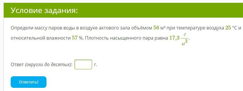 Определи массу паров воды в воздухе актового зала объёмом 56 м³ при температуре воздуха 25 °С и относительной влажности 57 %. Плотность насыщенного пара равна 17,3 гм3.